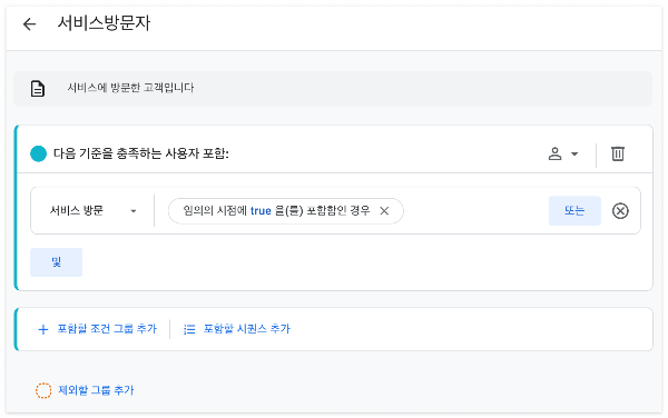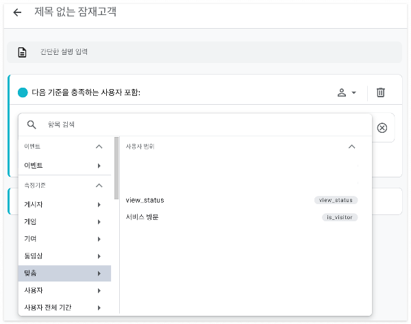 [새 잠재고객 만들기]-[맞춤 잠재고객 만들기]를 통해 원하는 사용자 속성을 마음대로 조합해 잠재고객을 만들 수 있다.