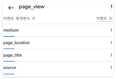 아래는 향상된 측정을 사용할 경우 자동으로 기록되는 이벤트 page_view의 매개변수로 UTM 파라미터가 들어간 모습이다. 앞의 utm_ 프리픽스는 빠지고 medium, source, campaign만 기록 된다.