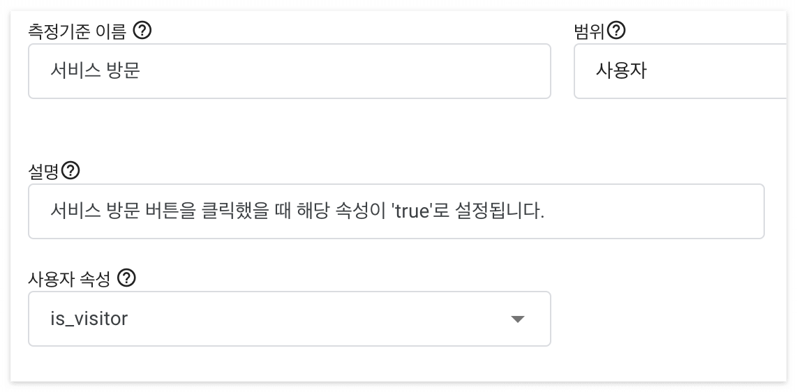 위에 정의된 함수를 사용하여 사용자 속성을 GA4에 전송해도 그 정보는 보고서에 남지 않는다. 커스텀 사용자 속성을 이용하려면 맞춤 측정기준을 설정해야 한다.