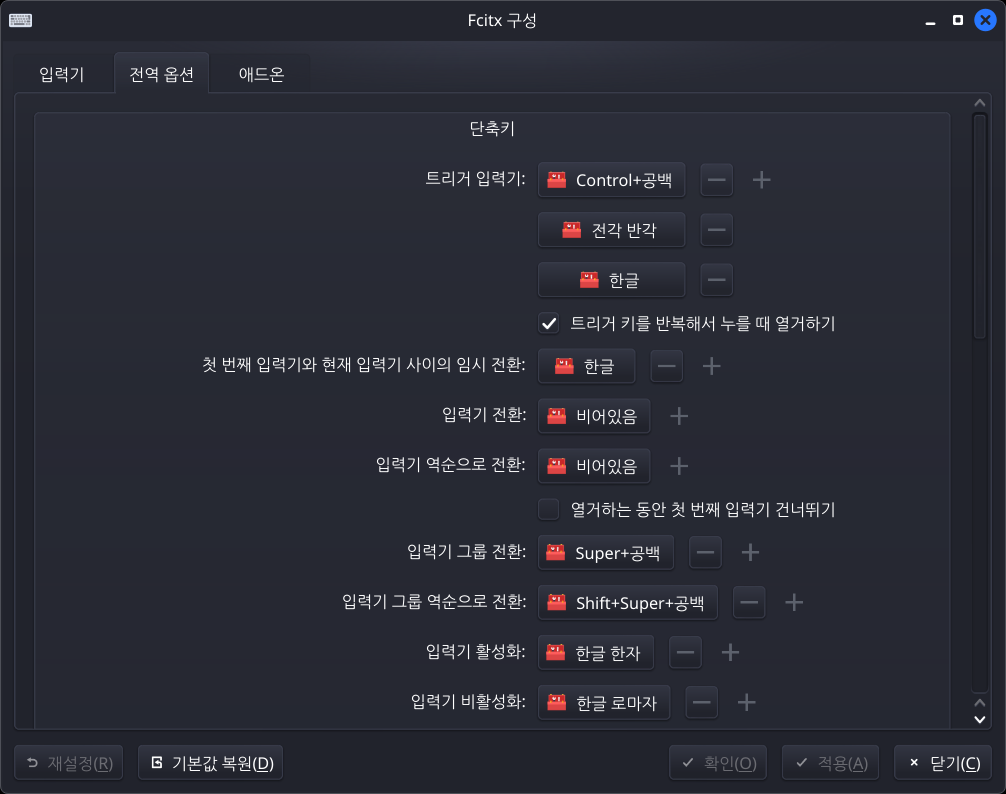 cmd에서 fcitx5-configtool 들어가서 한/영 전환 설정을 한다.