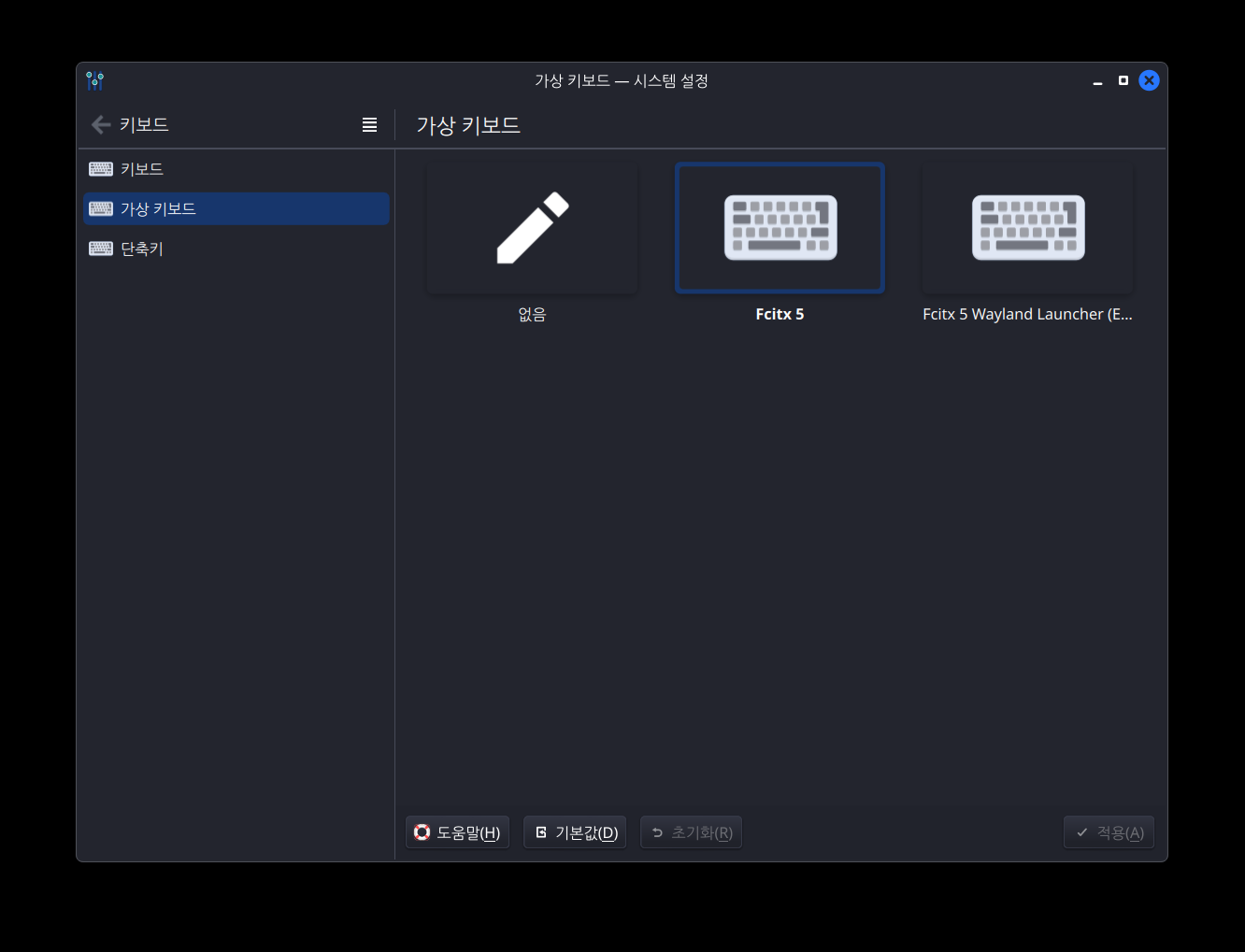 시스템 설정 > 키보드 > 가상 키보드에서 Fcitx 5를 선택한다.