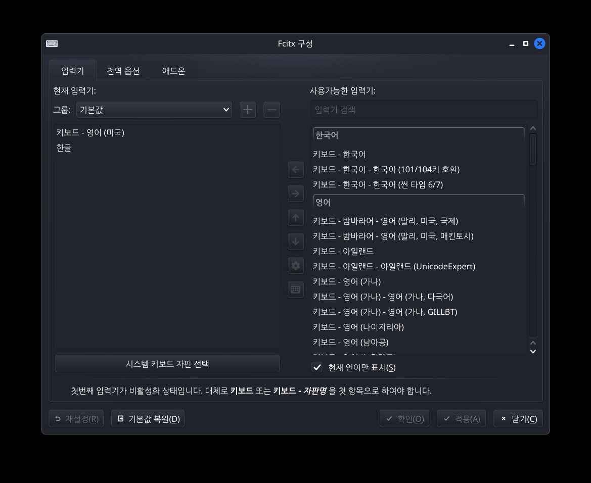 이렇게 설정하면 이제 기본언어가 한국어로 바뀌는데 입력은 여전히 영어만 된다.