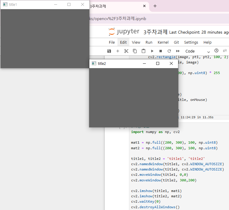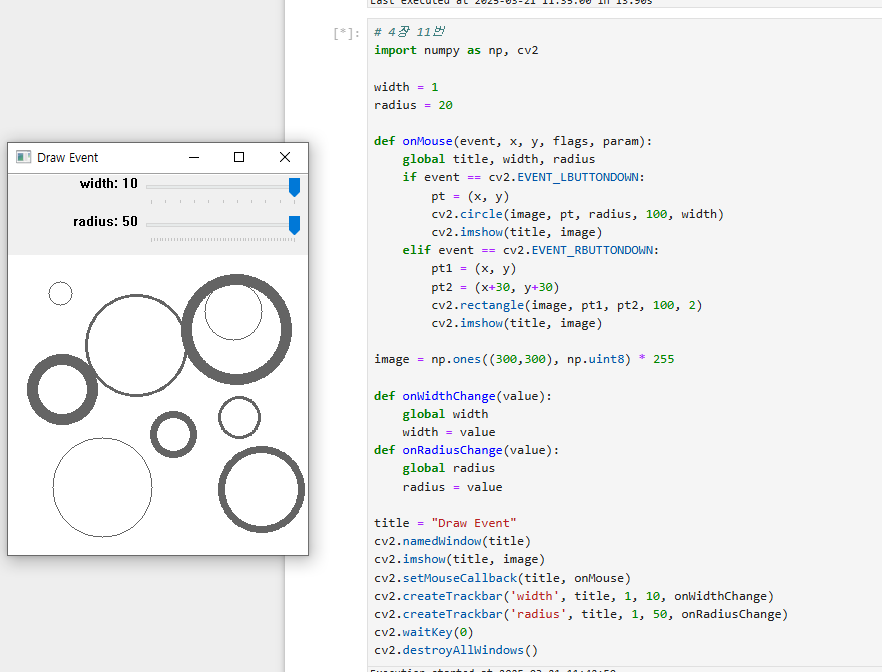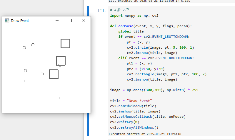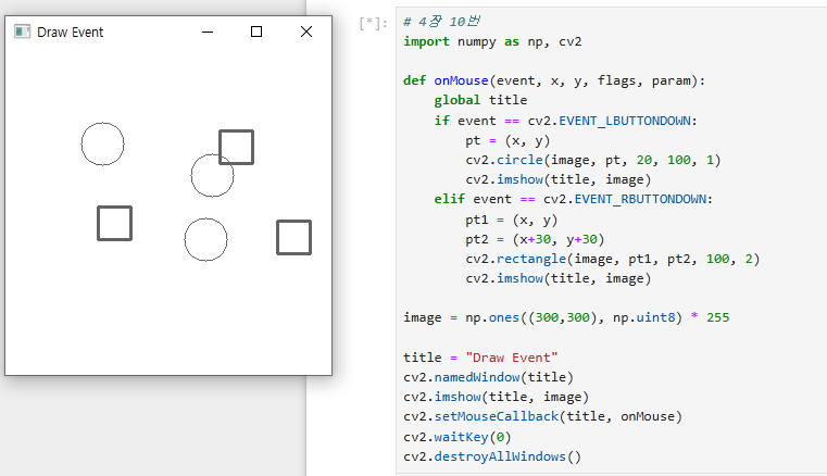 cv2.circle() 함수와 cv2.rectangle() 함수에서 사용되는 pt 변수가 정의되지 않아 오류가 발생한다. 이를 고쳐주면 좌클릭 시 윈도우에 원이 그려지고, 우클릭 시 윈도우에 사각형이 그려진다.