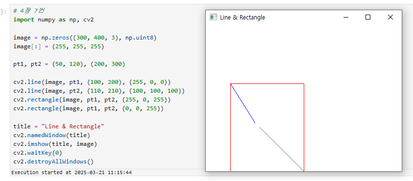 400행, 600열, 3채널 행렬을 만들고, 모든 채널을 흰색(255, 255, 255)로 초기화 한다. 이렇게 초기화된 흰색 바탕에 (50, 100)에서 (200, 300)으로 이어지는 5px 두께의 초록색 선을 그린다. 또 (200, 300)과 (300, 400)에 꼭짓점을 둔 빨간색으로 채워진 직사각형을 그린다. 이를 “Line & Rectangle”이라는 이름의 윈도우에 표시하고 키 입력을 기다린다. 키 입력이 생기면 윈도우를 없앤다.