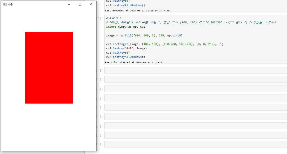 9. 600행, 400열의 윈도우를 만들고, 영상 안의 (100, 100) 좌표에 200*300 크기의 빨간 색 사각형을 그리시오.