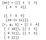 | import numpy as np, cv2 data = [1,2,3,4,5,6,7,8,9,10,11,12] # reshape(2,3,2)를 하면 2채널이 되어 rgb 3개의 채널로 분리가 불가함. 따라서 reshape(2,2,3)으로 수정 m1 = np.array(data).reshape(2,2,3) r,g,b = cv2.split(m1) print("[m1] = %s" % m1) print("[r, g, b] = %s, %s, %s" % (r,g,b)) |