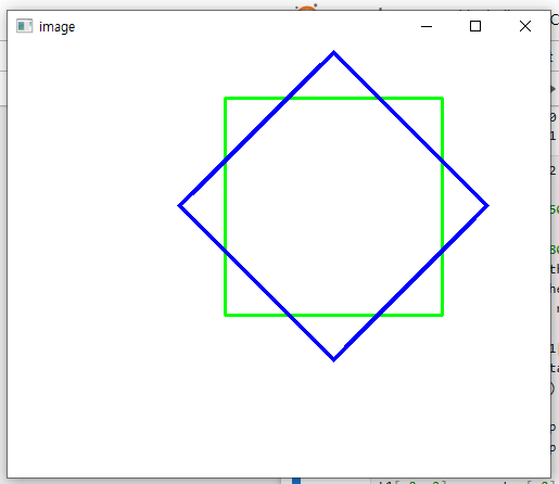 | import numpy as np, cv2 pts1 = np.array([(200,50,1), (400, 50, 1), (400, 250, 1), (200, 250, 1)], np.float32) theta = 45 * np.pi / 180 m = np.array([[np.cos(theta), -np.sin(theta), 0], [np.sin(theta), np.cos(theta), 0], [0,0,1]], np.float32) delta = (pts1[2] - pts1[0])// 2 center = pts1[0] + delta print('center=',center) t1 = np.eye(3, dtype=np.float32) t2 = np.eye(3, dtype=np.float32) t1[:2, 2] = -center[:2] t2[:2, 2] = center[:2] m2 = cv2.gemm(t2, m, 1, None, 0) m2 = cv2.gemm(m2, t1, 1, None, 0) pts2 = cv2.gemm(pts1, m2, 1,None, 1, flags=cv2.GEMM_2_T) for i, (pt1, pt2) in enumerate(zip(pts1, pts2)): print("pts1[%d] = %s, pts2[%d] = %s"%(i, pt1, i, pt2)) image = np.full((400, 500, 3), 255, np.uint8) cv2.polylines(image, [np.int32(pts1[:,:2])], True, (0, 255, 0), 2) cv2.polylines(image, [np.int32(pts2[:,:2])], True, (255, 0, 0), 3) cv2.imshow("image", image) cv2.waitKey(0) cv2.destroyAllWindows() |