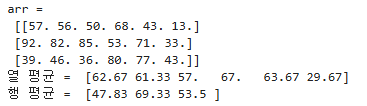 | import numpy as np, cv2 arr = np.random.rand(3, 6) * 1000//10 col_avg = cv2.reduce(arr, dim=0, rtype=cv2.REDUCE_AVG) # 행방향 축소 -> 열 평균 row_avg = cv2.reduce(arr, dim=1, rtype=cv2.REDUCE_AVG) # 열방향 축소 -> 행 평균 print('arr = \n', arr) print('열 평균 = ', col_avg.flatten().round(2)) print('행 평균 = ', row_avg.flatten().round(2)) |