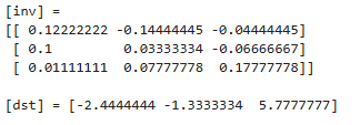 | import numpy as np, cv2 data = [ 3, 6, 3, -5, 6, 1, 2,-3, 5] m1 = np.array(data, np.float32).reshape(3,3) m2 = np.array([2, 10, 28], np.float32) ret, inv = cv2.invert(m1, cv2.DECOMP_LU) if ret: ret, dst = cv2.solve(m1, m2, cv2.DECOMP_LU) # 연립방정식 풀이 print("[inv] = \n%s\n" % inv) print("[dst] =", dst.flatten()) # 행렬을 벡터로 변환 else: print("역행렬이 존재하지 않습니다.") |