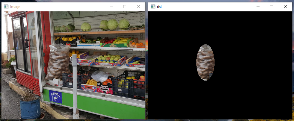 | import numpy as np, cv2 image = cv2.imread("images/color.jpg", cv2.IMREAD_COLOR) if image is None: raise Exception("영상파일 읽기 오류") mask = np.zeros(image.shape[:2], np.uint8) center = (190, 170) cv2.ellipse(mask, center, (30,60), 0,0,360,255, -1) dst = cv2.bitwise_and(image, image, mask=mask) # 윈도우 정렬 x = y = 100 for title in ['image', 'dst']: cv2.namedWindow(title, 1) cv2.moveWindow(title, x, y) x += image.shape[1] + 10 cv2.imshow(title, eval(title)) cv2.waitKey(0) cv2.destroyAllWindows() |