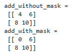 | import numpy as np, cv2 src1 = np.arange(4, dtype=np.uint8).reshape(2,2) src2 = np.arange(4, 8, dtype=np.uint8).reshape(2,2) mask = np.array([0,1,1,1], dtype=np.uint8).reshape(2,2) add_without_mask = cv2.add(src1, src2) add_with_mask = cv2.add(src1, src2, mask=mask) print('add_without_mask =\n', add_without_mask) print('add_with_mask =\n', add_with_mask) |