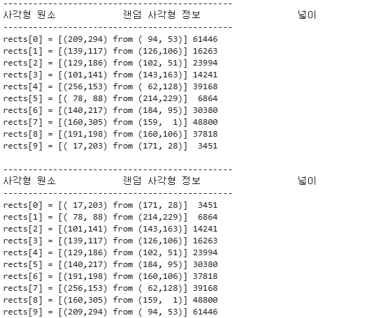 | import numpy as np, cv2 def print_rects(rects): print("-" * 46) print("사각형 원소\t\t랜덤 사각형 정보\t\t 넓이") print("-" * 46) for i, (x,y, w,h, a) in enumerate(rects): print("rects[%i] = [(%3d,%3d) from (%3d,%3d)] %5d" %(i, w, h, x, y, a)) print() rands = np.zeros((10, 5), np.uint16) starts = cv2.randn(rands[:, :2 ], 100, 50) ends = cv2.randn(rands[:, 2:-1], 300, 50) sizes = cv2.absdiff(starts, ends) areas = sizes[:, 0] * sizes[:, 1] rects = rands.copy() rects[:, 2:-1] = sizes rects[:,-1] = areas idx = cv2.sortIdx(areas, cv2.SORT_EVERY_COLUMN + cv2.SORT_ASCENDING).flatten() print_rects(rects) print_rects(rects[idx.astype('int')]) |