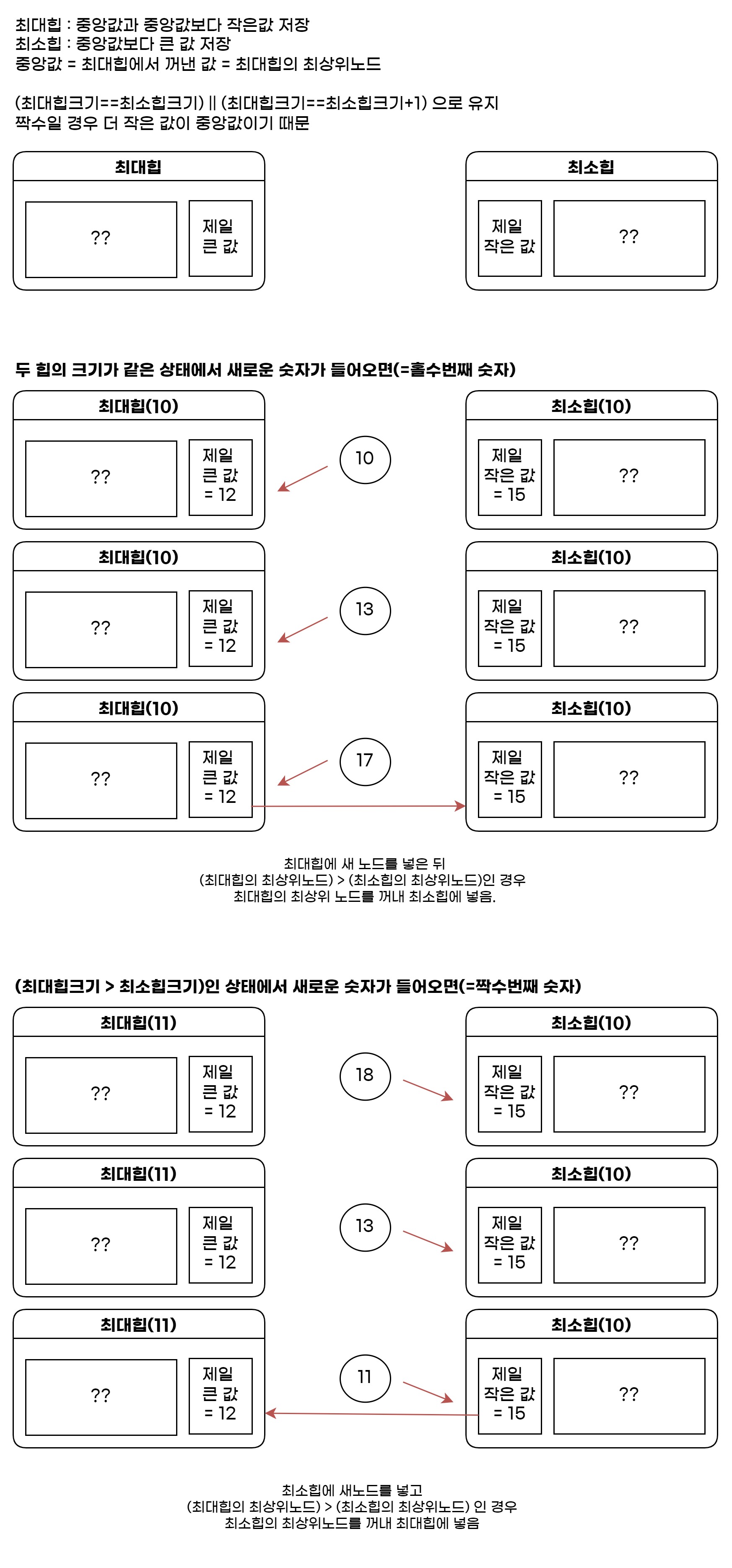 크기에 의존해 값을 먼저 넣은 후 최대힙의 최상위노드와 최소힙의 최상위노드에 따라 각 힙의 최상위노드를 이동할지말지 결정한다.